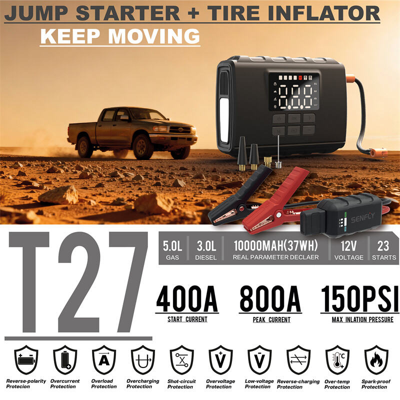 SENFLY Boost T27: SENFLY T27 2-in-1 Jump Starter with Air Compressor, 800A 12V Portable Battery Booster (Up to 5.0L Gas/3.0L Diesel), 150PSI Tire Inflator with big screen