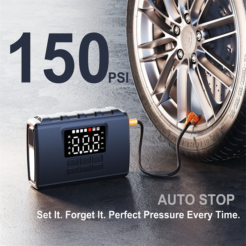 Tire inflator — Employing a 19mm cylinder, it can inflate tires from 0 to 35psi in 6 minutes, integrated into a long, narrow housing. It combines multiple emergency functions with a compact size and portability, making it an essential tool for travel.