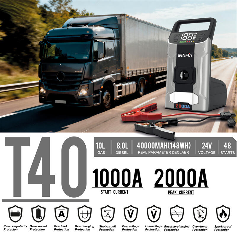 The SENFLY T40 is a compact yet powerful 2000-amp lithium jump starter, engineered to safely jump-start a dead vehicle battery in seconds—making it the ideal choice for 24V trucks, boats, SUVs, vans, and various other vehicles. Tailored specifically for transport vehicles, this portable car battery booster delivers robust performance while remaining lightweight and portable, sparing your arms from the strain of lugging around heavy lead-acid starter batteries. It is suitable for gasoline engines with a displacement of up to 12.0 liters or diesel engines of up to 12.0 liters. The unit features built-in "10-in-1 UltraSafe Technology," incorporating multiple safety mechanisms—including spark-proof connections, reverse-polarity protection, and short-circuit protection—to ensure it serves as a safe and foolproof battery booster for any 24-volt vehicle. It also doubles as a portable power bank, supporting the PD 30W fast-charging protocol to provide crucial power to smartphones, tablets, and other devices when you need it most. Furthermore, it is equipped with a "2-in-1" lighting system: a built-in 500-lumen LED flashlight offers three lighting modes (including an SOS signal and an emergency strobe mode), while a separate floodlight illuminates a wide area. In the event of a nighttime vehicle breakdown, it can be switched to a red warning light mode—proving invaluable for night work, enhancing roadside visibility, or handling emergency situations. Thanks to its ultra-compact, rugged design and a heavy-duty casing that meets the 94-V0 fire-retardant standard, this jump starter can easily withstand harsh conditions, including water splashes, dust ingress, accidental drops, and rough handling. The T40 comes complete with heavy-duty jumper cables, a USB-C charging cable, and a dedicated storage bag; all accessories are backed by a 1-year warranty, and the entire unit has been meticulously designed and crafted by a team of jump-starter experts with 15 years of industry experience. Whether you are looking for a car jump starter, a battery booster box, or a portable power pack—or simply wish to keep a reliable emergency battery unit on hand in your vehicle—the T40 delivers unparalleled performance, dependable durability, and complete peace of mind. It stands guard over every road transport operation, helping to minimize unexpected setbacks and ensure more on-time deliveries.