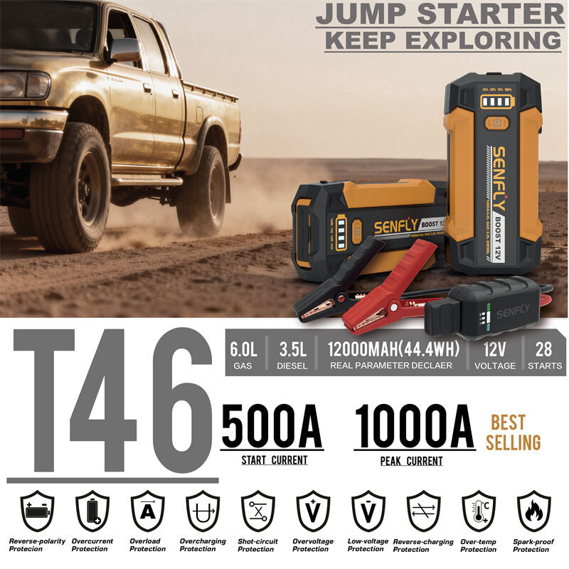 SENFLY The T46 is a product with an outstanding appearance, and it is popular in many countries. T46 is powerful 1000-amp lithium jump starter designed to safely jump start a dead car battery in seconds—perfect for cars, trucks, motorcycles, ATVs, boats, SUVs, vans, and more. This portable car battery jump starter delivers up to 28 jump starts on a single charge(Actual usage depends on vehicle condition, engine displacement, and environmental conditions.)and is rated for gasoline engines up to6.0 liters or 3.5L Diesel. Engineered with 10 in 1 UltraSafe Technology build-in, it features spark-proof connections, reverse polarity protection, short-circuit protection and so on. making it a safe and mistake-proof car battery booster for any 12-volt vehicle. It doubles as a portable power bank which support QC 18W for charging smartphones, tablets, and other devices when it matters most. Also, it includes an integrated 100-lumen LED flashlight with 3 light modes, including SOS and emergency strobe—ideal for night use, roadside visibility, or emergencies. With an ultra-compact, rugged design, 94-V0 Fire-Retardant Heavy-Duty Shell, this battery jump starter pack is built tough to withstand water, dust, drops, and rough handling. The T46 includes heavy-duty jumper cables, a USB-C charging cable, and a storage bag, all backed by a 1-year warranty and designed by a 15 years’ experience of jump starter expert team. Whether you’re looking for a car jump starter, battery jump box, jumper pack, power pack jump starter, or a reliable jump starter battery pack to keep in your glovebox, the T46 delivers unmatched performance, trusted durability, and peace of mind—on the road, off the grid, or wherever your next adventure takes you.